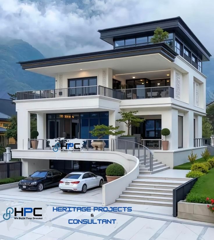 This image highlights a premium modern luxury residential project by HPC – Heritage Projects & Consultant, showcasing contemporary architectural excellence and superior construction standards. The residence features expansive balconies, large glass façades for abundant natural light, covered car parking, and refined exterior finishes that enhance both aesthetics and durability. With clean architectural lines, thoughtful spatial planning, and a sophisticated multi-storey façade, this home represents HPC’s commitment to quality, functionality, and elegant urban living. Ideal for high-end residential developments, real estate branding, and modern architectural inspiration.